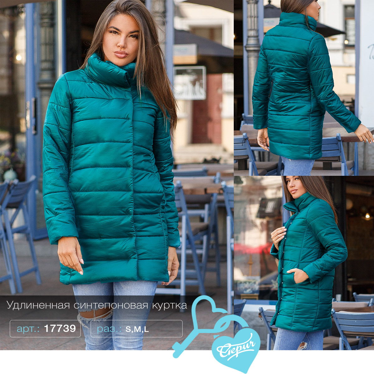 Актуальная удлиненная куртка прямого кроя на синтепоне: простой воротник-стойка, длинный рукав без манжет, два кармана в швах по бокам и два ряда скрытых застежек-кнопок спереди.